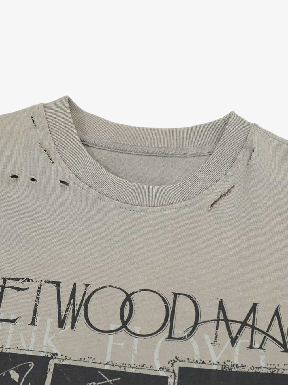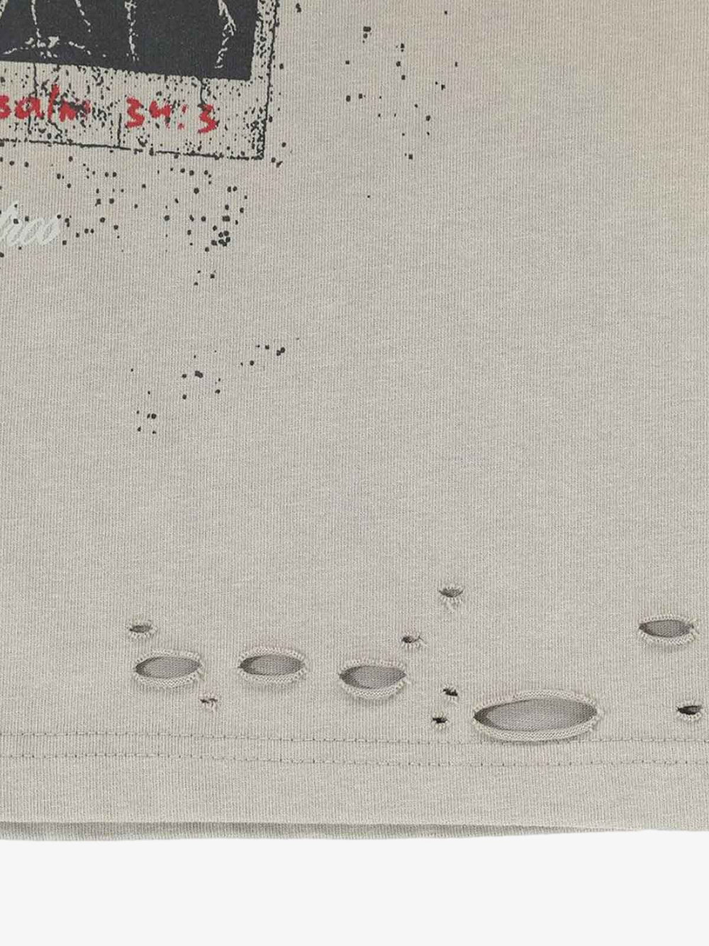 • Detail Features: Distressed holes along the hemline. graphic print on the chest. splatter paint effect