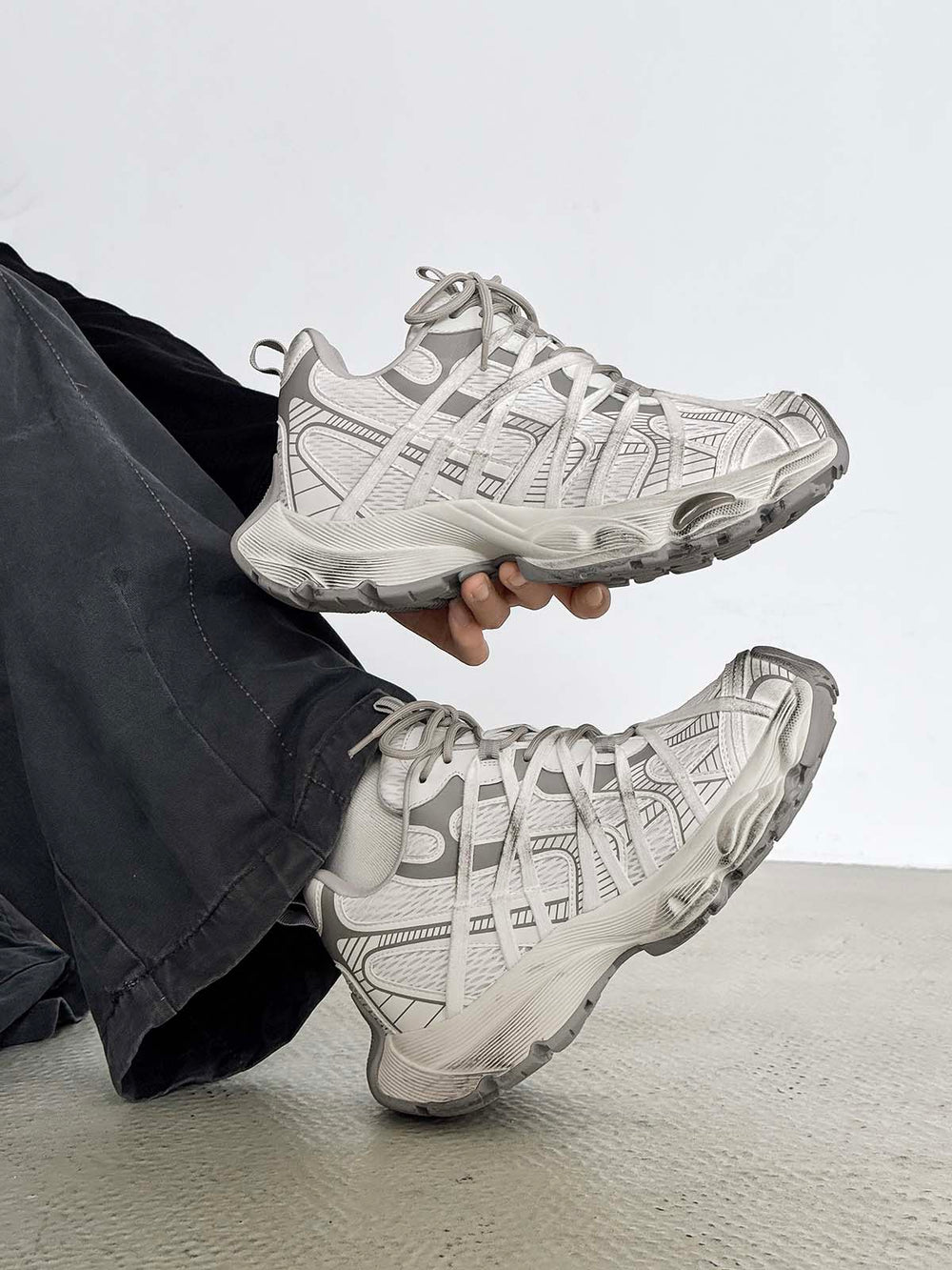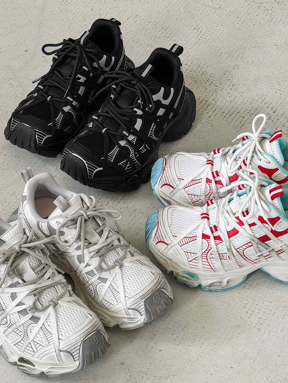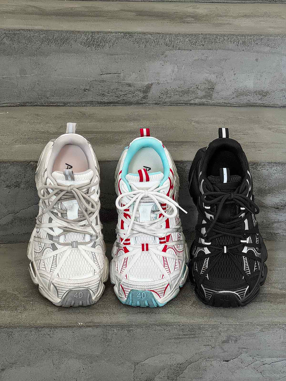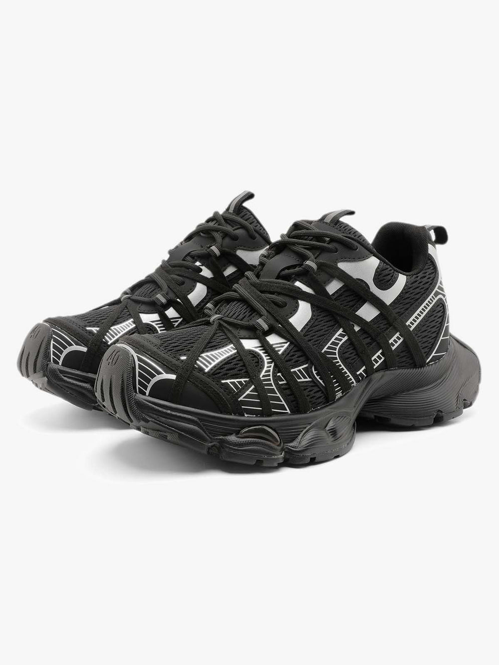 • Design Elements: Bold color contrast. geometric patterns. layered sole design