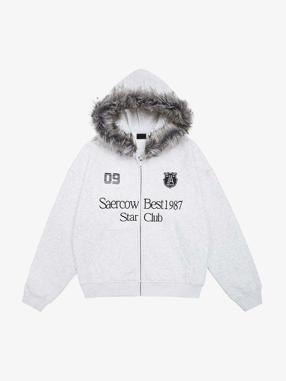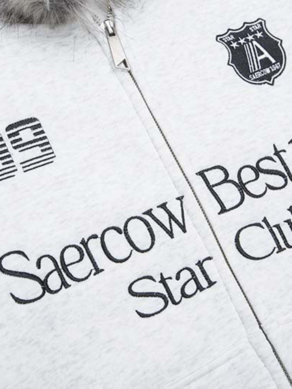 • Design Elements: Embroidered text details. faux fur-lined hood. front zipper closure