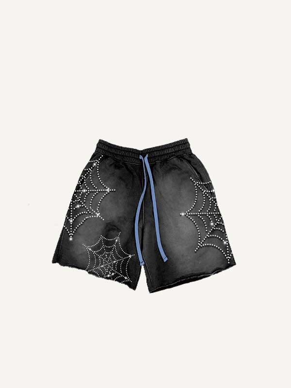 Spider Web Faux Rhinestones Print Drawstring Waist Shorts