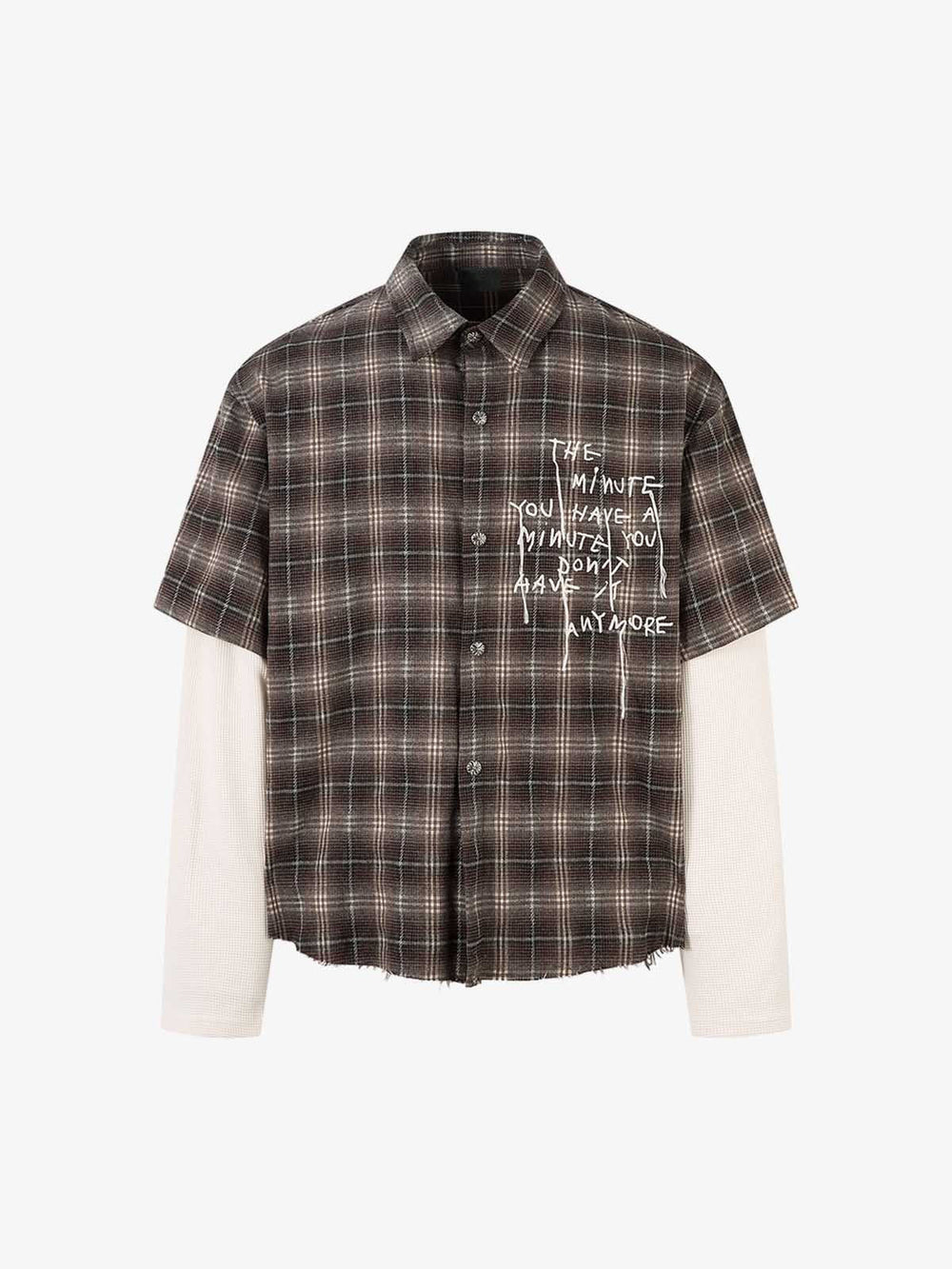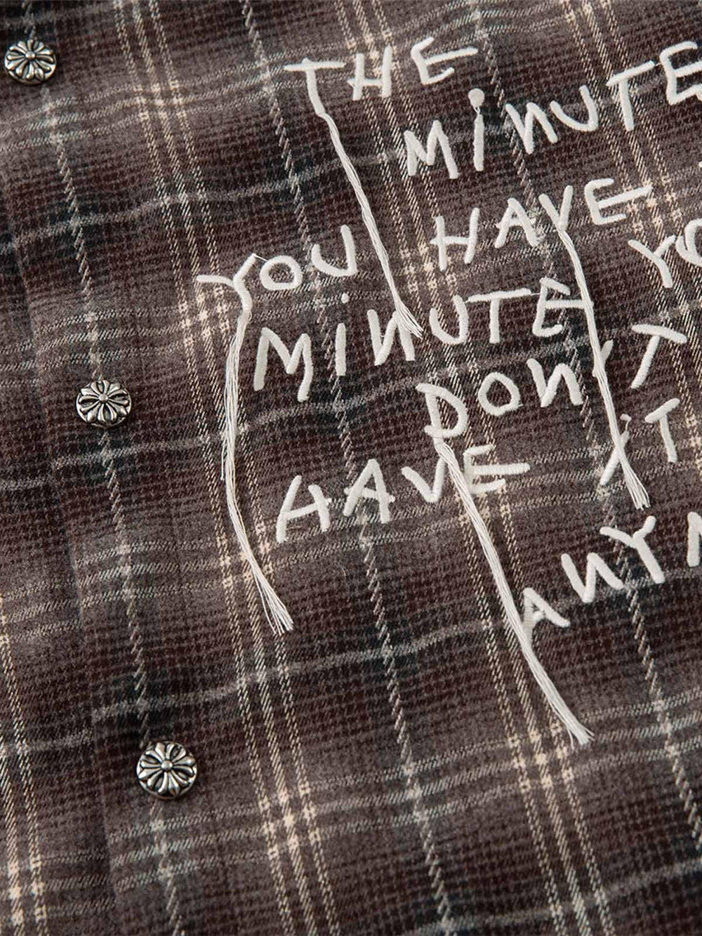 • Detail Features: Embroidered text design. button-down closure. frayed hem detail