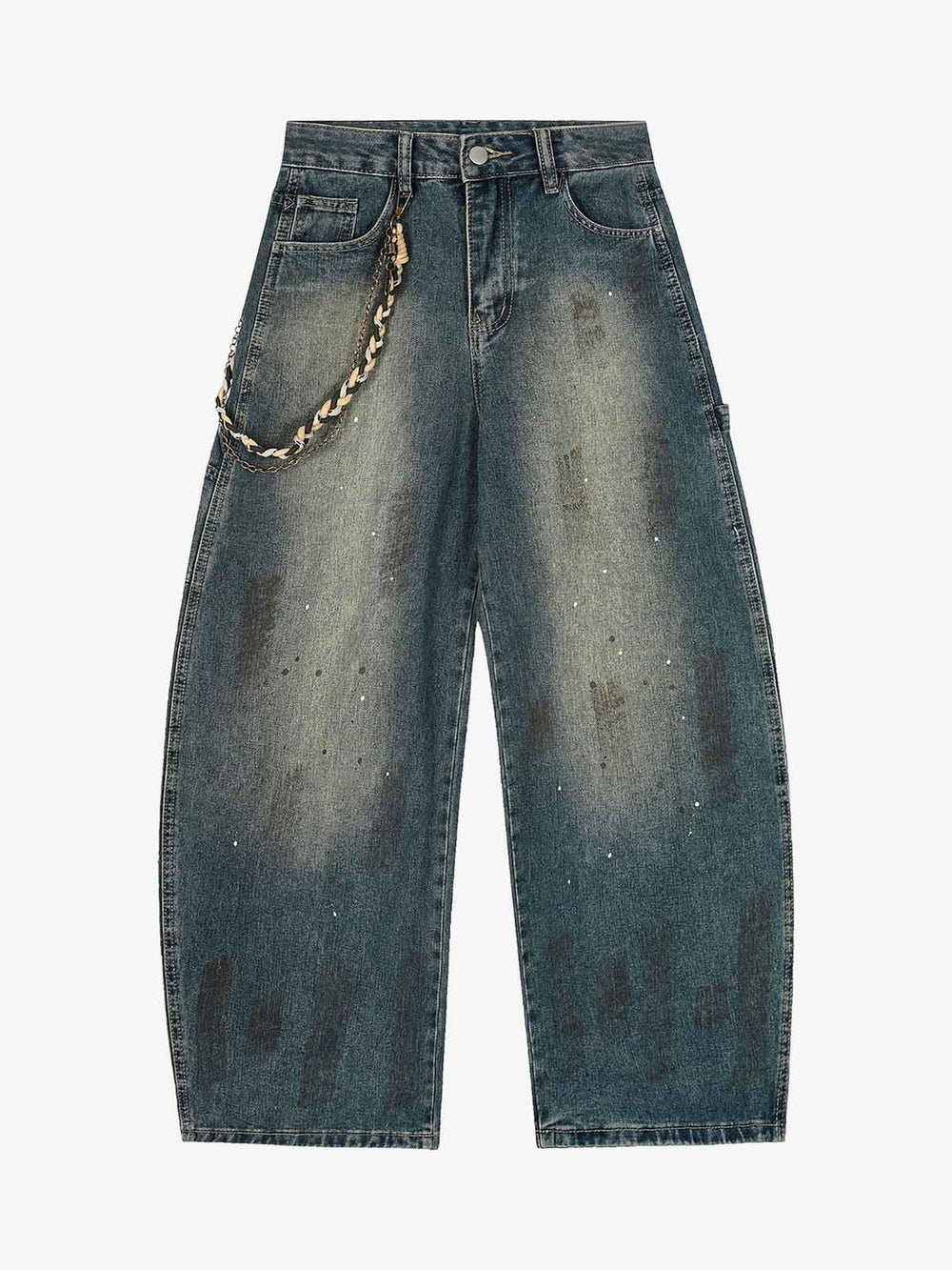 • Design Elements: Braided chain accessory. distressed patches. faded wash effect
