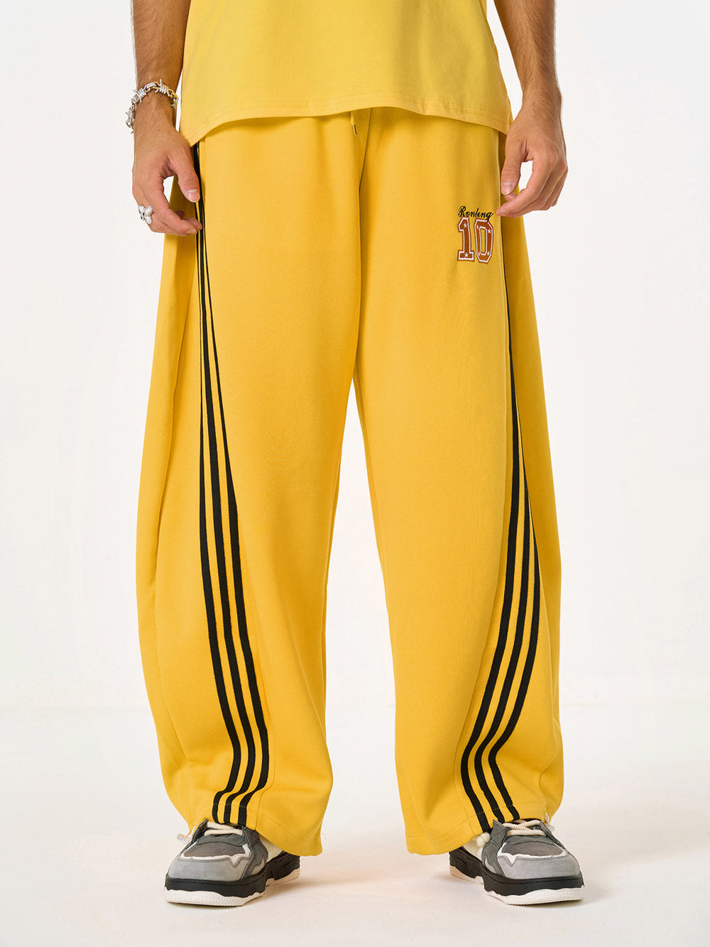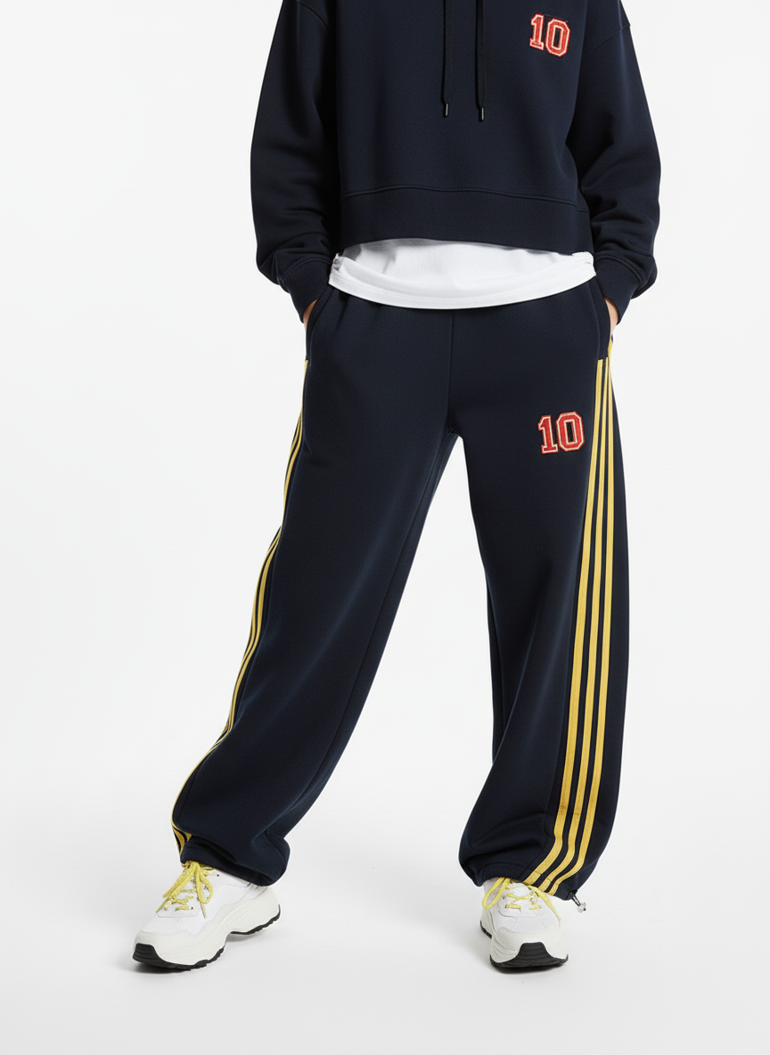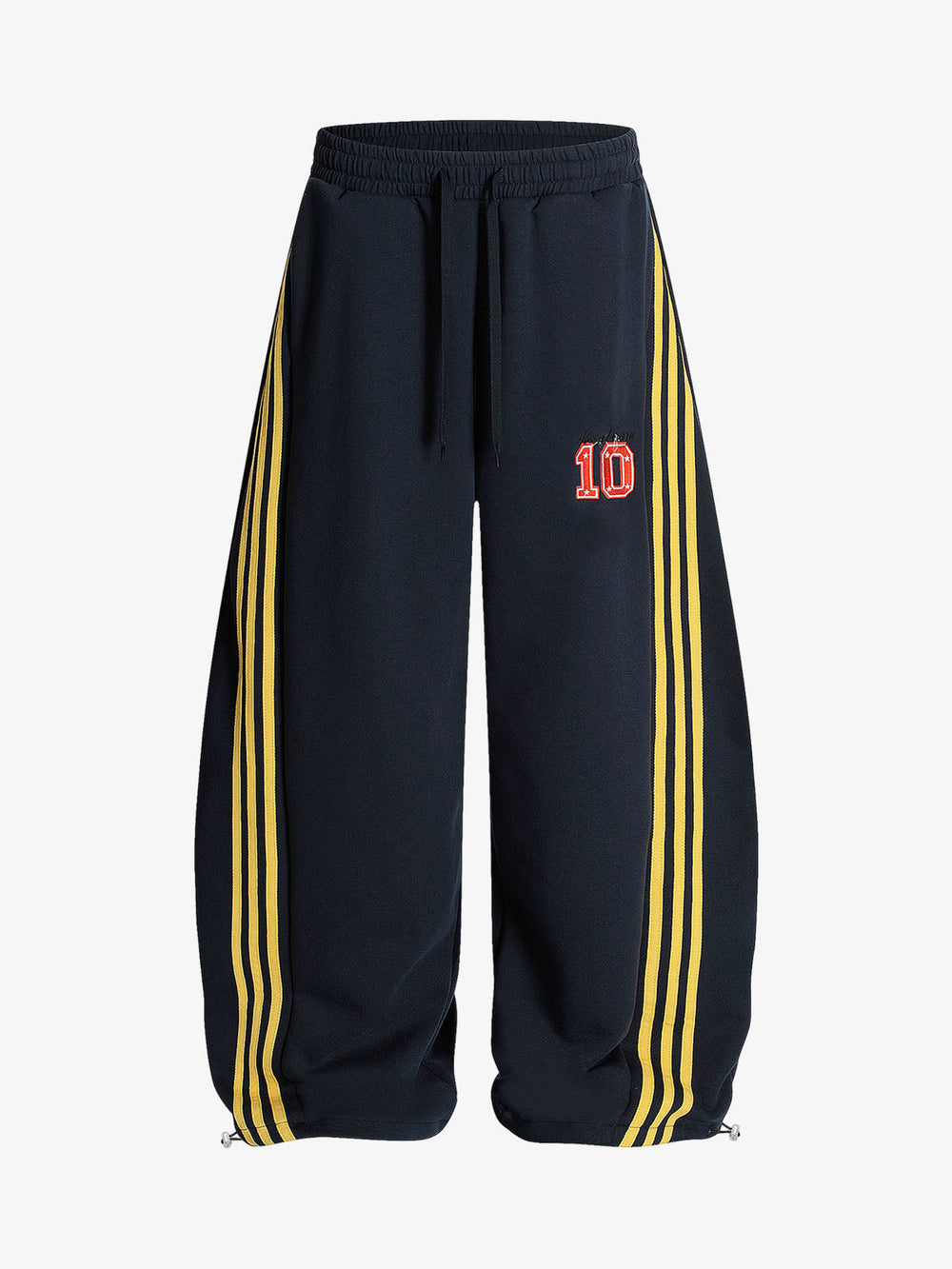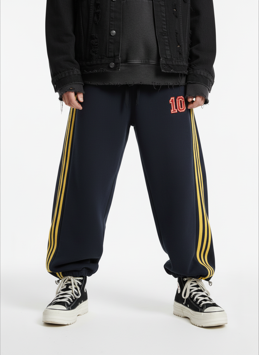 • Detail Features: Elastic waistband with drawstring. side stripes. number design on the leg